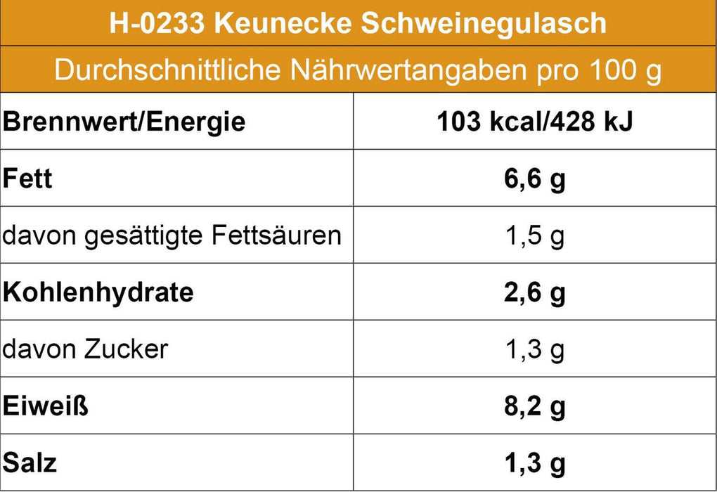 Zutaten: Schweinefleisch (51%), Trinkwasser, Zwiebeln, Rapsöl, modifizierte