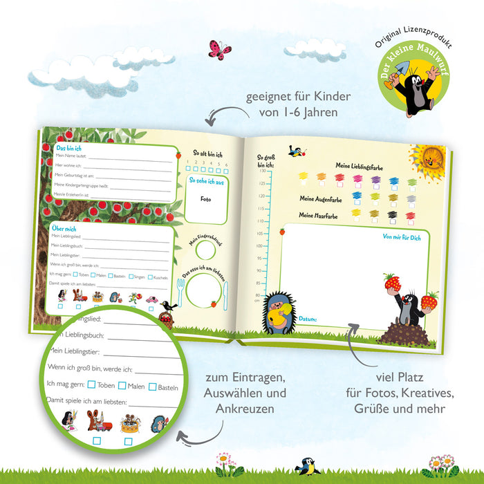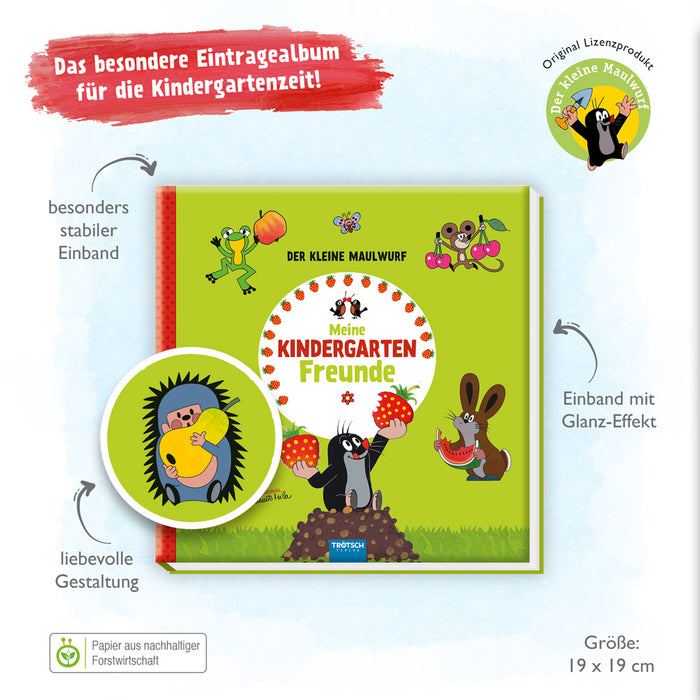 Zusammen mit den liebsten Freunden macht alles gleich doppelt so viel Spaß! Das finden auch der kleine Maulwurf und seine Freunde. Dieses bezaubernde Freundebuch bietet einen tollen Rahmen, um wertvolle Erinnerungen an die Kindergartenzeit zu bewahren. Es gibt nicht nur reichlich Platz für die Steckbriefe aller Freunde, sondern auch viele Extraseiten für Fotos und Notizen sowie einen Geburtstagskalender. So bleiben die schönsten Momente während dieser wichtigen und aufregenden Zeit in guter Erinnerung!