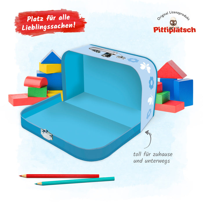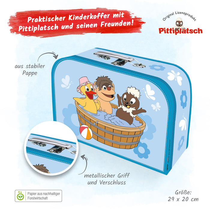 Ein wunderschöner Kinderkoffer aus Pappe mit dem kleinen Pittiplatsch und seinen Freunden beim fröhlichen baden. Super geeignet für den Besuch bei der Tagesmutter, im Kindergarten oder im Hort. Der Koffer hat einen Metallhenkel und -verschluss. Größe: 29 x 20 cm