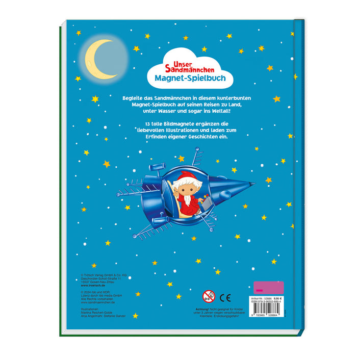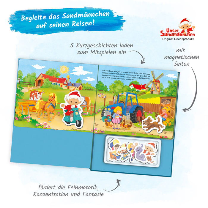 Interaktives Vorlesen. In diesem tollen Bilderbuch mit magnetischen Seiten und Magneten können die Kleinen aktiv zeigen, dass sie gespannt zuhören, wenn sie das Sandmännchen auf seinen Reisen zu Land, unter Wasser und sogar ins Weltall begleiten. 13 tolle Bildmagnete ergänzen die liebevollen Illustrationen und laden zum Erfinden eigener Geschichten ein.