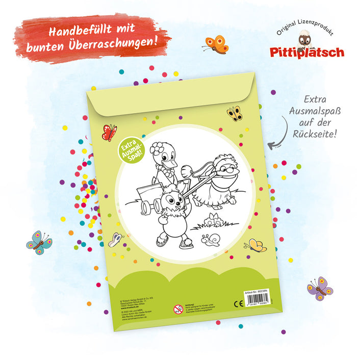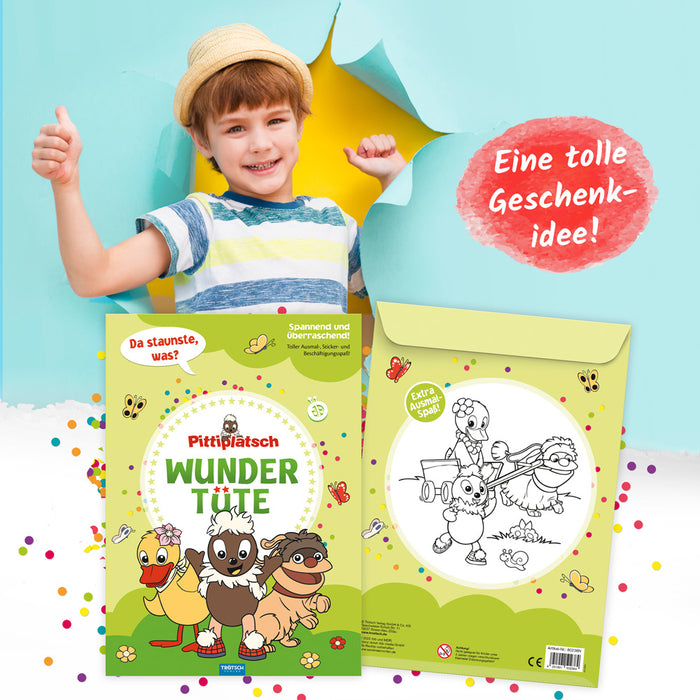 Pitti und seine Freunde lieben Überraschungen, deshalb haben sie diese Wundertüte mit tollen Pittiplatsch-Produkten zusammengestellt! Die Wundertüte enthält ein Mal- und Beschäftigungsbuch, einen Bogen mit fröhlichen Stickern sowie eine weitere Überraschung. Das perfekte Geschenk für Geburtstage, zur Einschulung oder als außergewöhnliches Party-Mitbringsel! Ideal für Kinder zwischen drei und sechs Jahren. Die Wundertüte besteht der Umwelt zuliebe aus Papier und als Bonus gibt es ein Bild zum Ausmalen auf der Rückseite. Der Inhalt kann variieren.