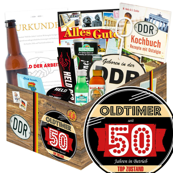 Oldtimer - seit 50 Jahren in Betrieb - Geschenkset Ostpaket "Männer Box"