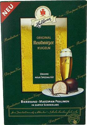 Bierbrand - Marzipan Pralinen in zarter SchokoladeZwei Premium Marken aus mitteldeutscher Tradition vereinen sich in dieser Kreation zu runder Höchstform. Edelmarzipan, abgerundet mit einem Schuß feinsten Reudnitzer Bierbrandes, umhüllt von zartschmelzender Halloren Schokolade, garantiert diesen besonderen Hochgenuß. Kugel für Kugel das pure Vergnügen.