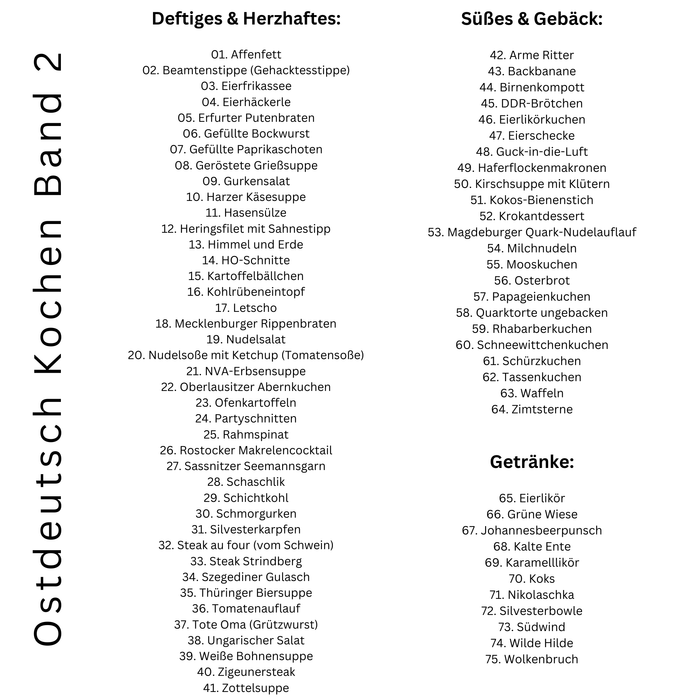 Tauchen Sie noch tiefer in die Klassiker der ostdeutschen Küche ein mit Ostdeutsch Kochen – Band 2, dem zweiten Band des beliebten DDR-Videokochbuchs! Auf 96 Seiten im handlichen DIN A5-Format erwarten Sie 75 weitere authentische Rezepte, liebevoll bebildert und im Hardcover-Farbdruck gestaltet. Die in Eigenverlag 2019 erschienene 2. Auflage lädt dazu ein, nostalgische Gerichte wie Soljanka, Jägerschnitzel und LPG-Kuchen neu zu entdecken.