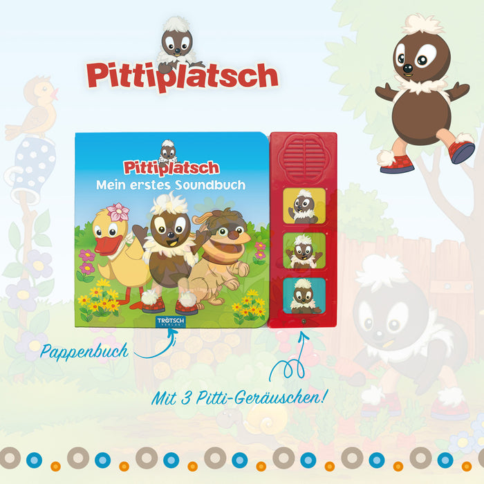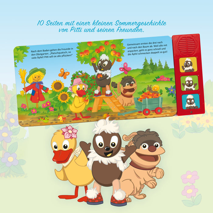 Kleines Pappenbuch mit Soundleiste und drei typischen Geräuschen von Pittiplatsch zum Anhören und selbstständigen Beschäftigen zu Hause.