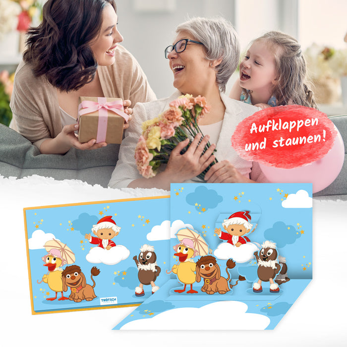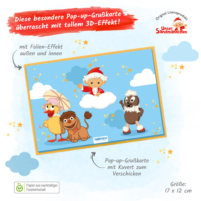 Aufklappen und Staunen! Diese besondere Pop-Up-Grußkarte vom Sandmännchen, Pittiplatsch und ihren Freunden überrascht mit tollem 3D-Effekt und bietet dabei genügend Platz für liebe Worte oder Glückwünsche zu ganz besonderen Anlässen. Eine wunderbare Geschenkidee mit Überraschungseffekt, die kleine und große Sandmann-Fans gleichermaßen begeistert!