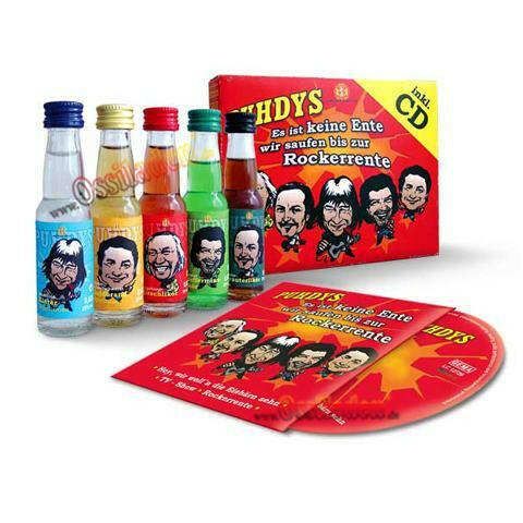"Fanartikel mit 5 Likörflaschen à 0,02l inklusive einer Mini-CD der Rockband ""Puhdys"".