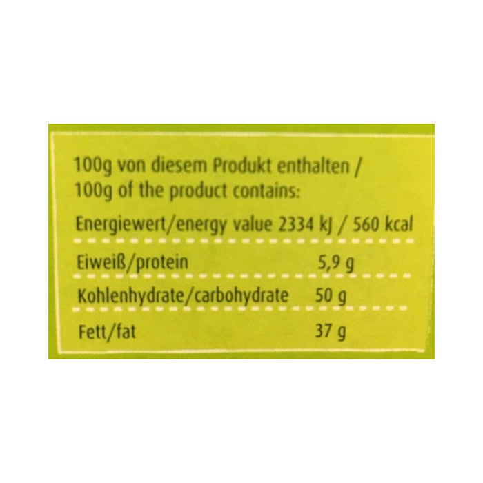 Nährwertangaben pro 100g: Brennwert 560kcal/2334kJ, Eiweiß 5,9g, Kohlenhydrate 50g, Fett 37g