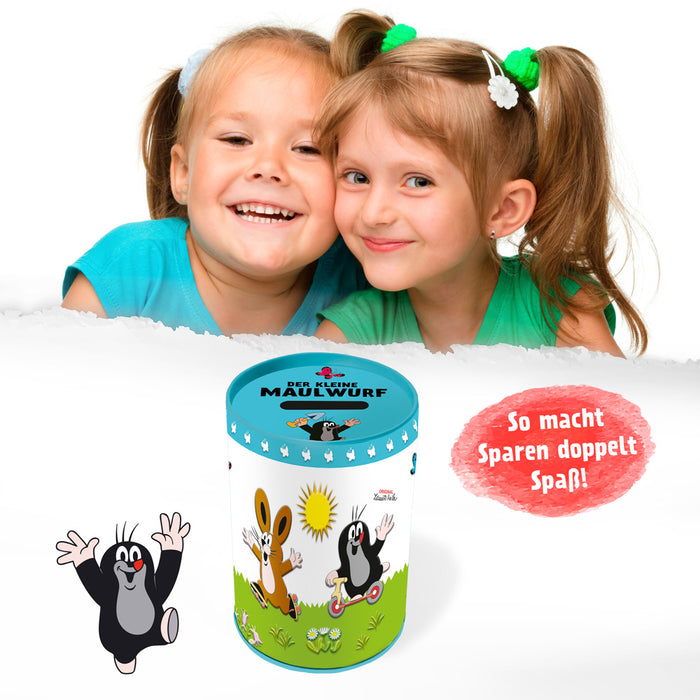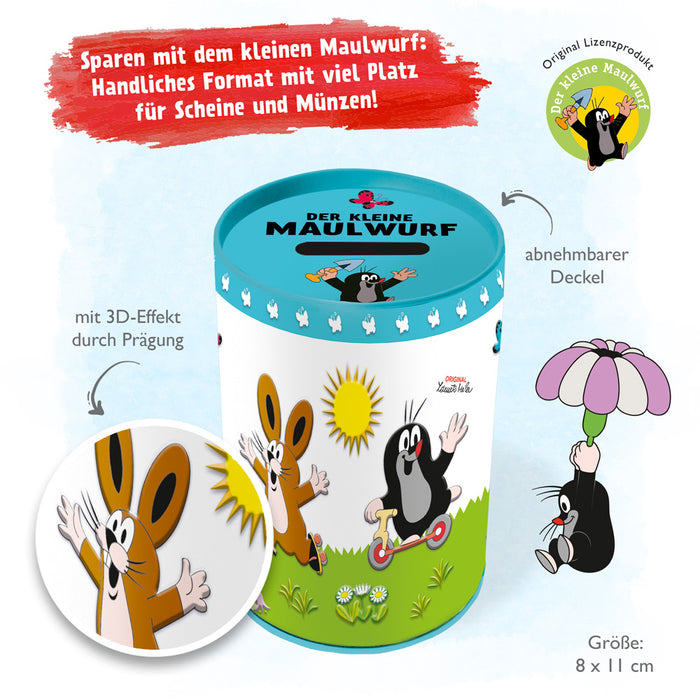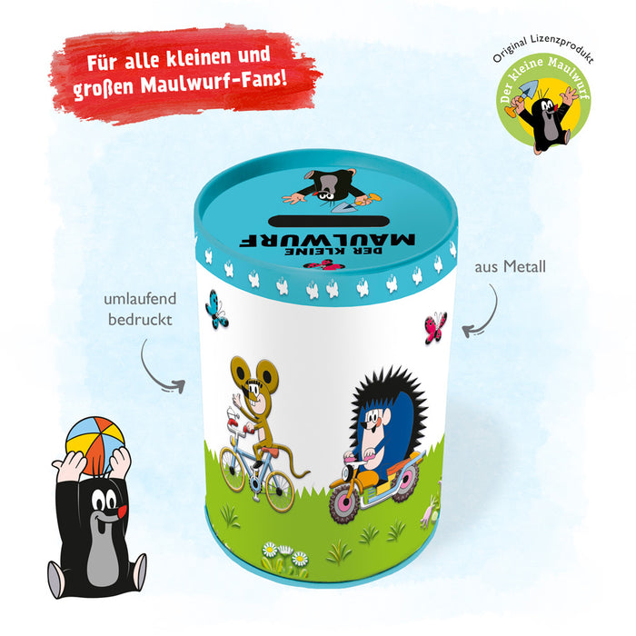 Damit aus einem kleinen Münzschatz mal ein großer wird, der Wünsche erfüllen kann, passt der kleine Maulwurf drauf auf! Dank abnehmbarem Deckel ist die hübsche Spardose aus Metall beliebig oft verwendbar. Ein tolles Geschenk, um Kinder den Wert von Geld selbst erfahren zu lassen – und ein Muss für alle kleinen Maulwurf-Fans!