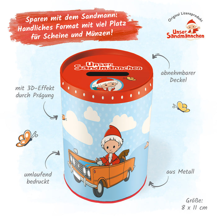 Damit aus einem kleinen Münzschatz mal ein großer wird, der Wünsche erfüllen kann, passt das Sandmännchen drauf auf! Dank abnehmbarem Deckel ist die hübsche Spardose aus Metall dauerhaft verwendbar. Ein tolles Geschenk, um Kinder den Wert des Geldes selbst erfahren zu lassen – und ein Muss für alle kleinen Sandmann-Fans!