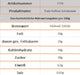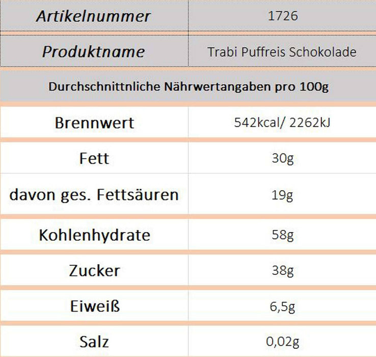 Nährwertangaben pro 100g: Brennwert 517kcal/2198kJ, Eiweiß 6,8g, Fett 29g davon gesättigte Fettsäuren 18g, Kohlenhydrate 57g davon Zucker 37g, Salz 0,03g