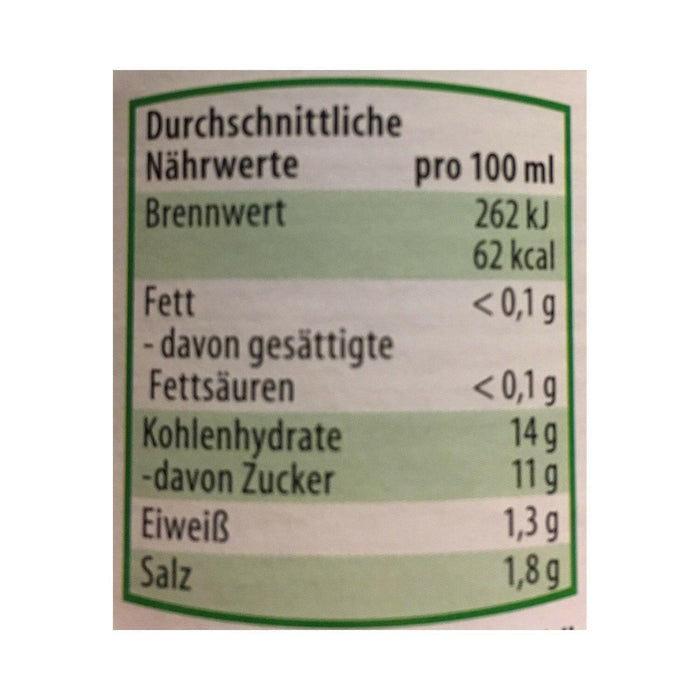 Nährwertangaben pro 100ml: Brennwert 62kcal/262 kJ, Fett <0,1g davon gesättigte Fettsäuren <0,1g, Kohlenhydrate 14g davon Zucker 11g, Eiweiß 1,3g, Salz 1,8g