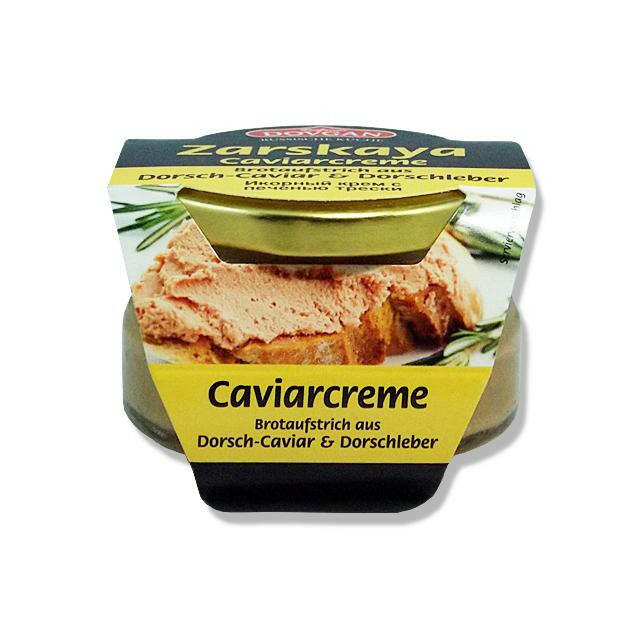 Unser Produkt ""Zarskaya Caviarcreme ""Dorschcaviar & Dorschleber" ist eine feine Creme, die aus 49% Dorsch-Caviar und 49% Dorschleber hergestellt wird. Der feine Geschmack des Aufstrichs wird mit Zwiebel, Piment und Muskatnuss abgerundet.