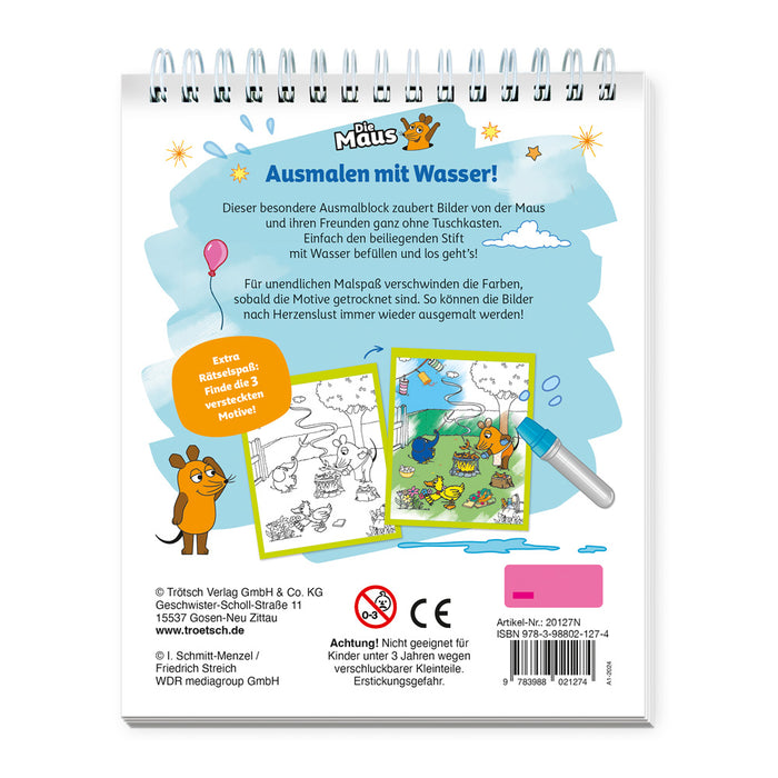 Mit Wasser malen wie von Zauberhand! Dieser besondere Ausmalblock hält tolle Maus-Motive bereit. Kleine Künstler kommen ganz ohne Tuschkasten oder zusätzliche Stifte aus! Einfach den beiliegenden Zauberstift mit Wasser befüllen, die Seiten ausmalen und schon erscheinen versteckte Farben und Motive. Für unendlichen Malspaß verschwinden diese, sobald die Seiten getrocknet sind. So können die Bilder nach Herzenslust immer wieder ausgemalt werden!