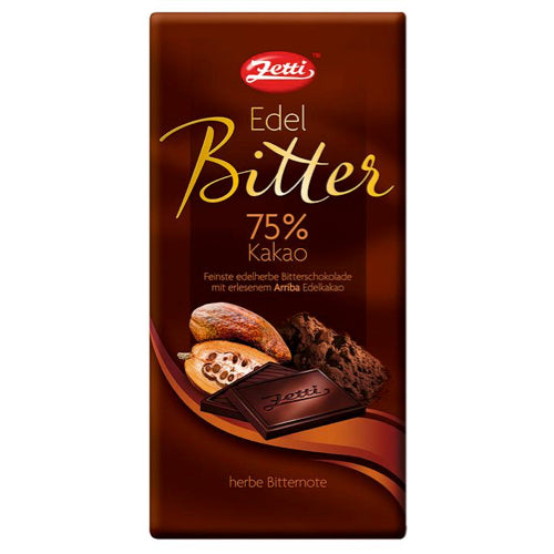 Zutaten: (Edelbitter): Kakaomasse (48%), Zucker, Kakaobutter, Emulgator: Lecithine. Kakao: 75% mindestens.